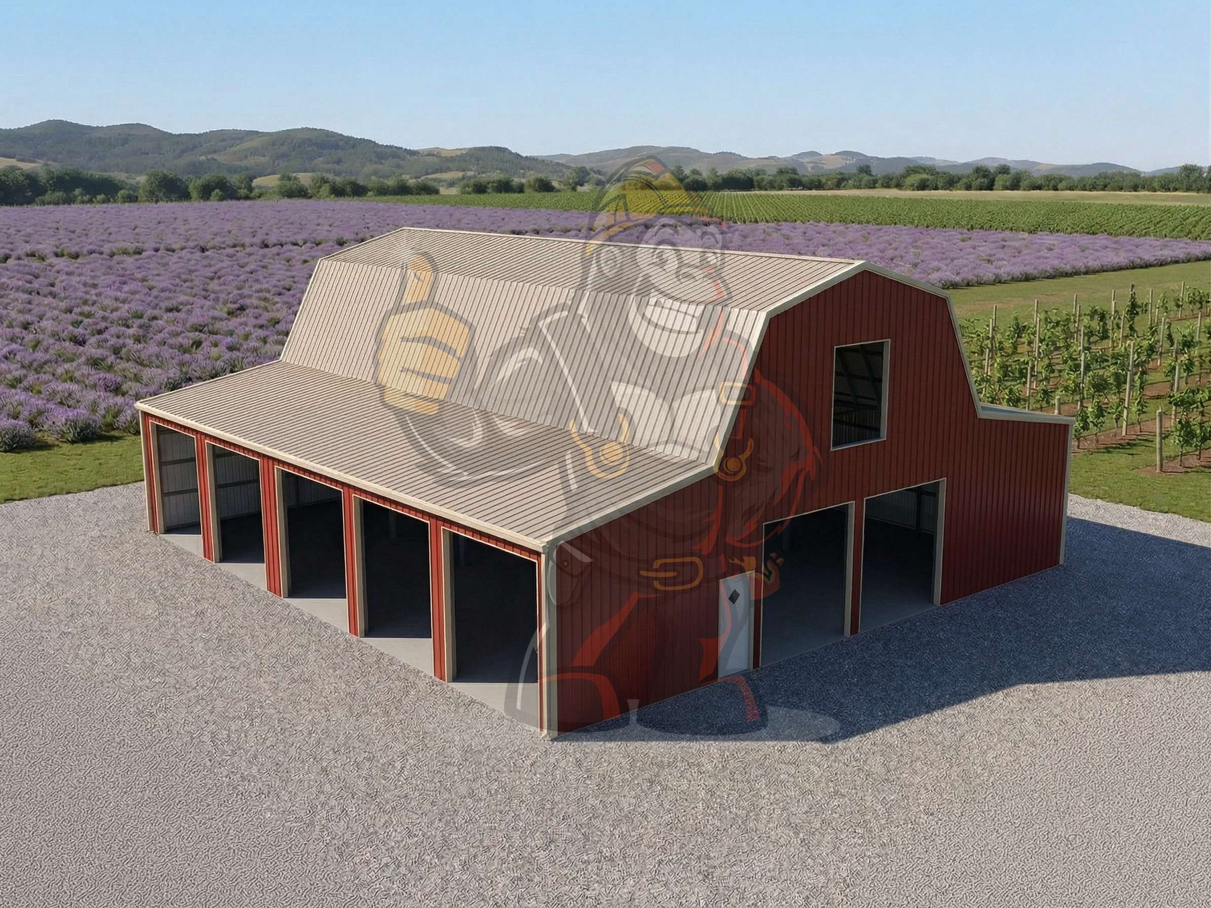 Upgrade your property with The Rhinoceros 40′ x 60′ x 14′ Gambrel Roof Steel Barn, the ultimate large barn for multi-vehicle storage, workshop space, equipment housing, or light commercial use. Its iconic gambrel roof delivers extra headroom and storage volume while the dual 10 ft doors provide easy access for trucks, tractors, and machinery.